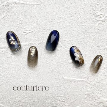 透け感のあるネイビーと落ち着いたトーンのマグネットにお花を合わせたデザインです😊